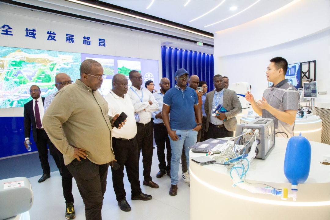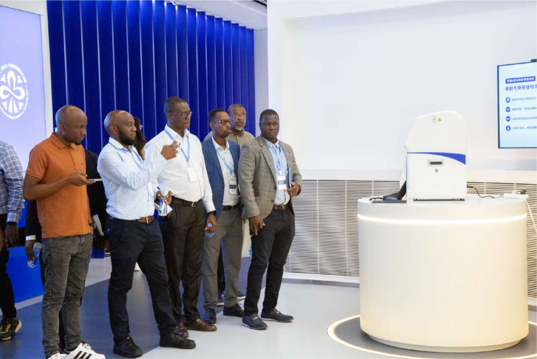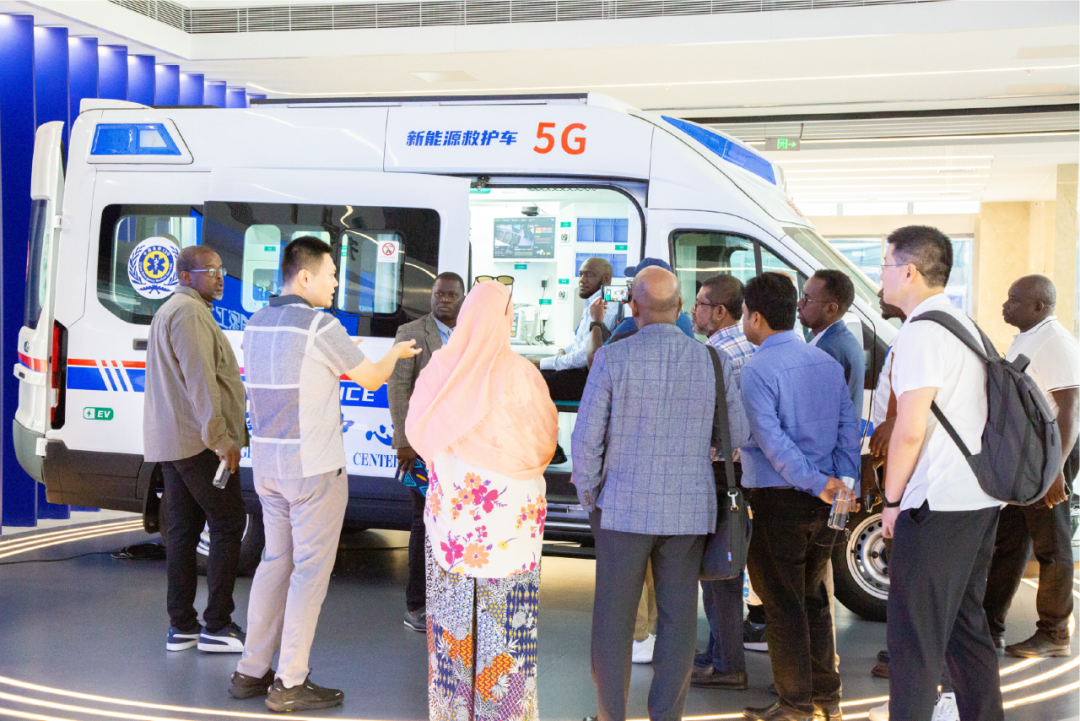 研学首站是复星北铃企业展厅,学员们通过实物观摩与深度讲解,系统了解了复星北铃在应急医疗装备研发与生产领域的核心成果 从双能X射线骨密度仪、便携式急救设备到5G+新能源救护车,直观感受中国医疗科技的创新突破,为跨文化卫生合作奠定技术认知基础。